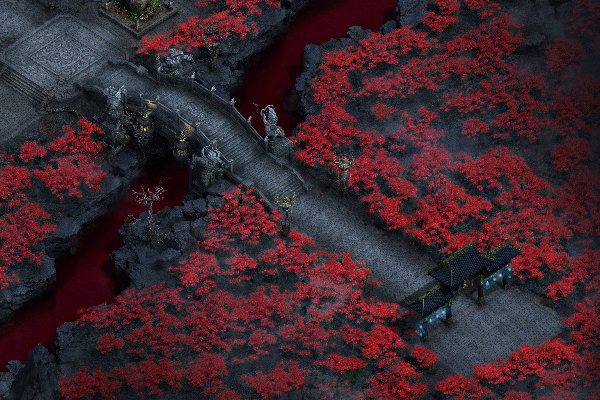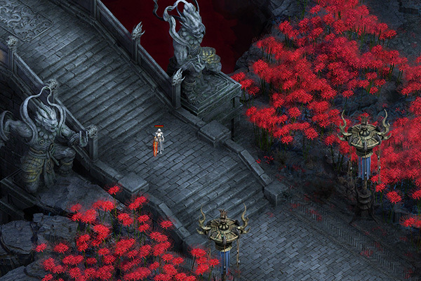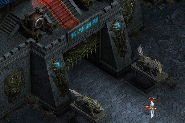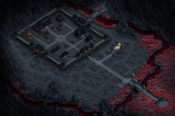 城池方正,四周有血色冥界之水,水边彼岸花盛开,有奈何桥架于红泉之上。幽都城四周有城墙,内部有阎罗阎罗大殿和幽冥各司部。