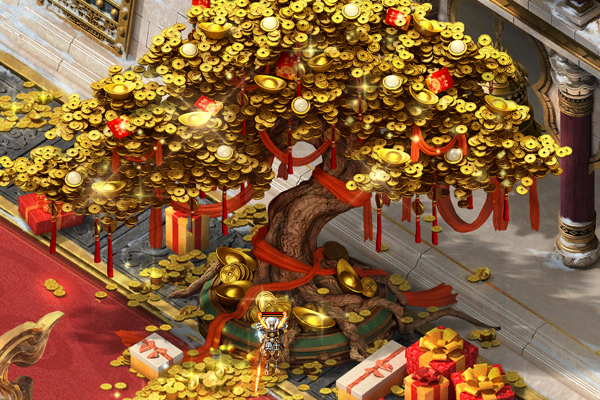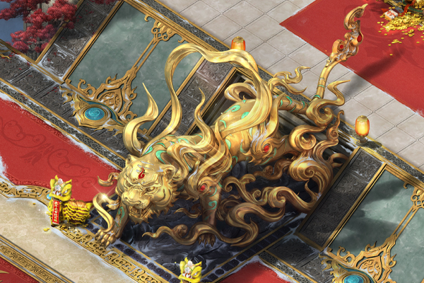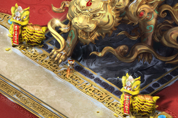 大殿里红色地毯铺陈,四周摆放着大红灯笼和华丽宫灯,带有惊喜的礼盒随机散落在殿内各处。主平台白虎雕像前,两只憨态可掬的舞狮向来客送上节日的祝福。主殿上方一棵金灿灿的招财树耀眼夺目,枝头挂满了金币元宝,树下堆满了礼包礼盒,节日氛围感十足。