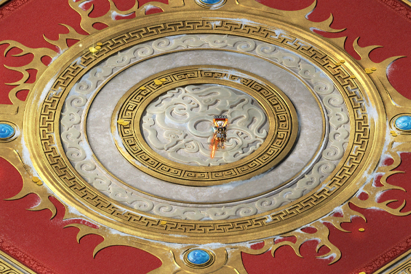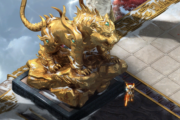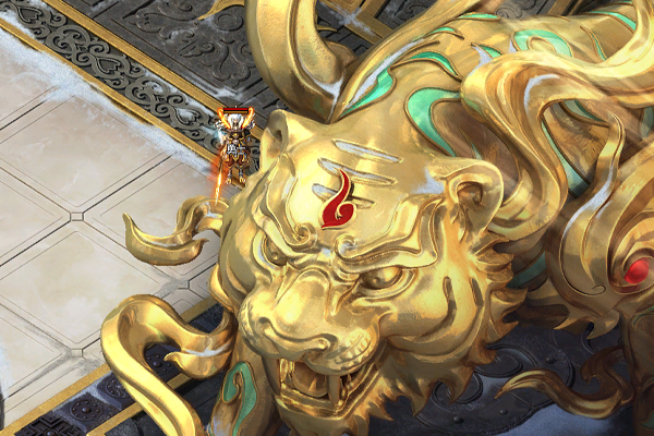 主殿由多处平台相连构成,平台外围生长着罕见的红松,于庄严中增添些许明媚。位于中央的主平台上立有黄金打造的巨大白虎雕像,其额前带烈焰印记,足踏祥云,大张虎口,蓄势待发,气势骇人。六座相对小型的白虎雕像呈守护姿态分立于前后、左右相连的平台上,震慑四方。