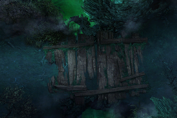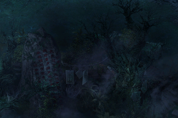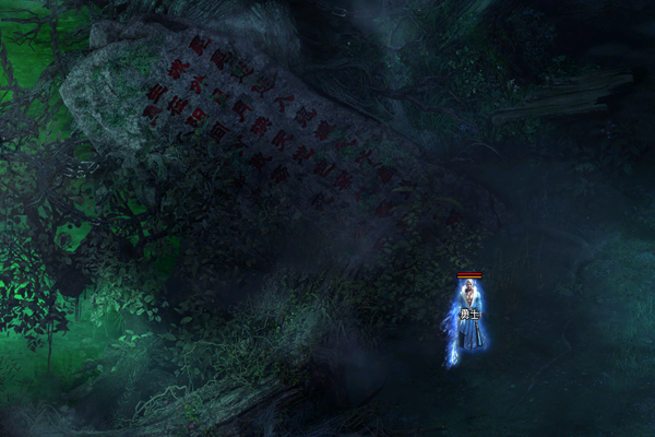 魔雾林常年处于浓雾之中,林中光线昏暗,其间散落着多个形状不规则的小水潭,潭水散发着莹莹绿光,透着诡异的气息。几颗璀璨夺目的夜明珠,置于台阶附近用以照明。