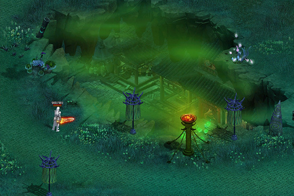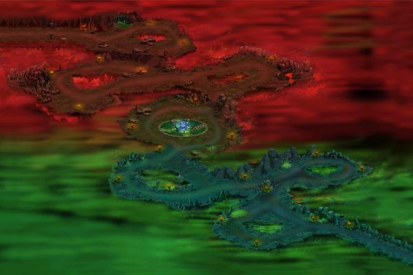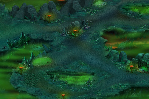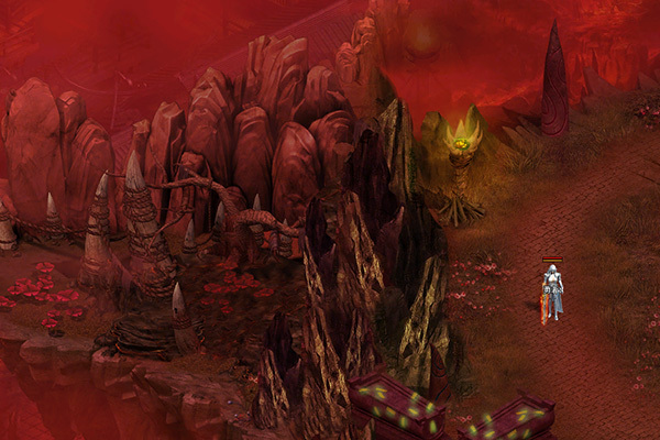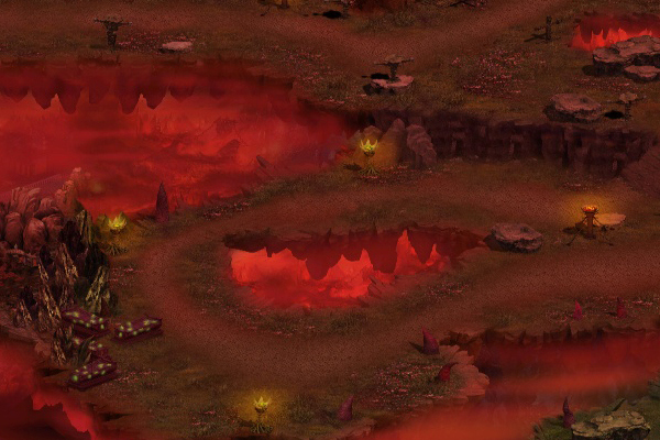 河流森林是一个极其阴冷的地区,一旦掉入便会被冲进地狱深处。独眼怯魔在此地偷食河水的恶灵,占据了河流周围的一些森林。