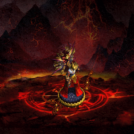 火德星君站在莲台之上,身穿金色铠甲。肩部、小臂、胯部有铠甲包裹,下身有金红色飘带裙装。全身皮肤为灰蓝色,左手手臂延伸至胸口有红色火焰纹身。头戴金色盔甲,头顶金色火焰状装饰。