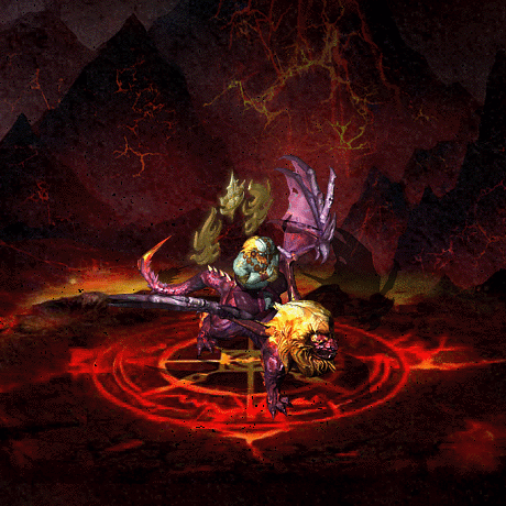 狮驼王的坐骑是一头雄壮的翼狮,狮子金毛,身体为紫红色皮肤,肌肉虬结,四肢和尾巴都有火焰在悦动。狮子有强壮的类似龙族双翼。狮驼王坐在狮子背上,双手结印端坐,皮肤为蓝色,上身赤裸。