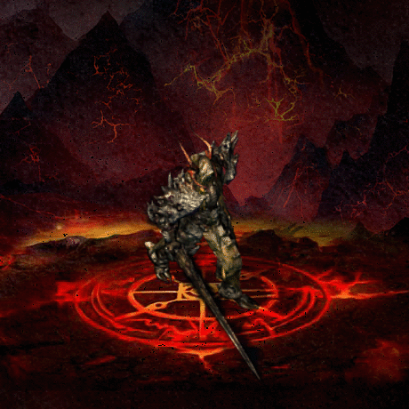 全身上下都被铠甲所包裹,铠甲金属材质,并不光泽,上面有很多凸起的刺和不规则起伏,肩膀处的铠甲更为厚重,头戴兜盔,头盔上有红色恶魔之角,手持宽刃不规则大剑。整体色彩为灰色和黑色色调。