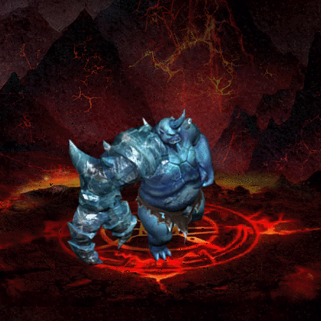 头上有着一根独角,身材健壮,全身皮肤呈寒冰般的深蓝色,上身赤裸,腰间有兽皮兜布,皮肤有如冰层上的裂纹一样的纹路,右臂异常粗大,为寒冰状岩石的外壳,尖端是巨大的钳,可以轻易夹碎寒铁。