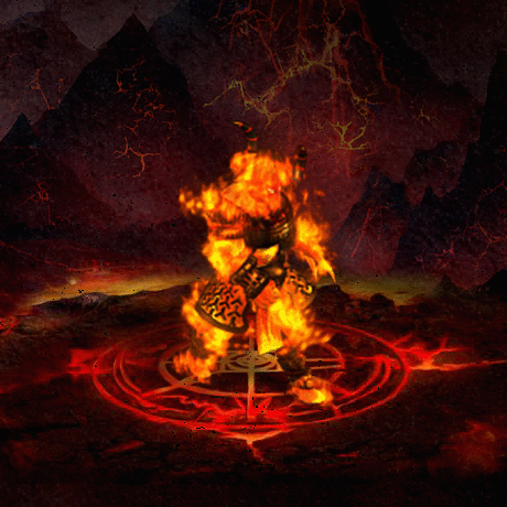 泰坦墨诺提俄斯,一个全身由火焰组成的巨人,火焰之外穿着黑铁的铠甲,肩膀上有巨大的恶魔牛角,一只手为拳头,一只手为巨大的火焰尖爪,头顶光秃秃,但是燃烧着火焰,给人一种凶狠恐怖的感觉。