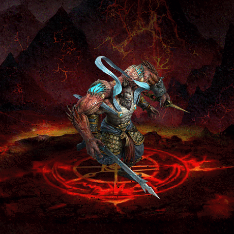 蚩尤身材魁梧,肩上飘扬蓝丝带,上身裸露,下身穿着战甲,手持一柄神兵利器。背后变化出一对形似兽类的、强健有力的赤红色手臂。一手如兽掌张开,一手紧握一柄尖槌武器。