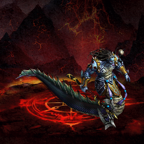 烛九阴,又称烛龙。半人半龙,可在水中游走,有岸上活动能力。上半身似人,蓝肤长发,狰狞面部,眼透红光,身穿铠甲,手持战斧。下半身是巨大无比的蛇形身躯,鱼鳞般的皮肤,腹部有蛇皮条纹。