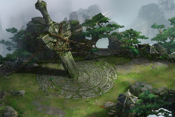 万寿山乃镇元大仙的修行之地,山中有座五庄观。其内风景如画,有瀑布、深潭,有索桥、栈道,还有一柄斩天宝剑斜插地面。