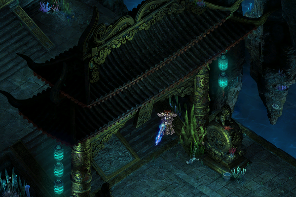 神殿通道方正笔直,沿途有着青色灯盏。神殿侍卫痴妄地龙遍布其中,守卫着神殿。最中央的神殿大厅,高处一个王座,有着青龙雕塑在墙壁上。