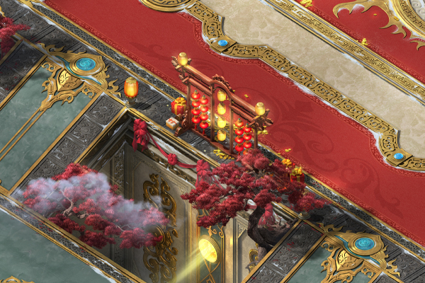 大殿里红色地毯铺陈,四周摆放着大红灯笼和华丽宫灯,带有惊喜的礼盒随机散落在殿内各处。主平台白虎雕像前,两只憨态可掬的舞狮向来客送上节日的祝福。主殿上方一棵金灿灿的招财树耀眼夺目,枝头挂满了金币元宝,树下堆满了礼包礼盒,节日氛围感十足。