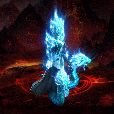 帕尔瓦蒂身材曼妙,婀娜多姿,头发由寒冰组成,飘逸在头顶,犹如戴着一顶巨大的冰冠一般,蓝色的肌肤充满着光泽,穿着蓝色衣袍,浑身散发着圣洁的光芒,脚下是两条呲牙列嘴的蓝色冰龙。